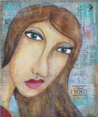 Mystele. First she showed us how to create a background with a lot of layers. Ok, that wasn't new to me, but the next step was so inspiring: she created a portrait based on the shapes she found in her background. I love this technique!!! The fun thing is that there are no rules while creating this portrait, so the eyes don't have to be exact halfway the head and the nose can be completely out of proportion.